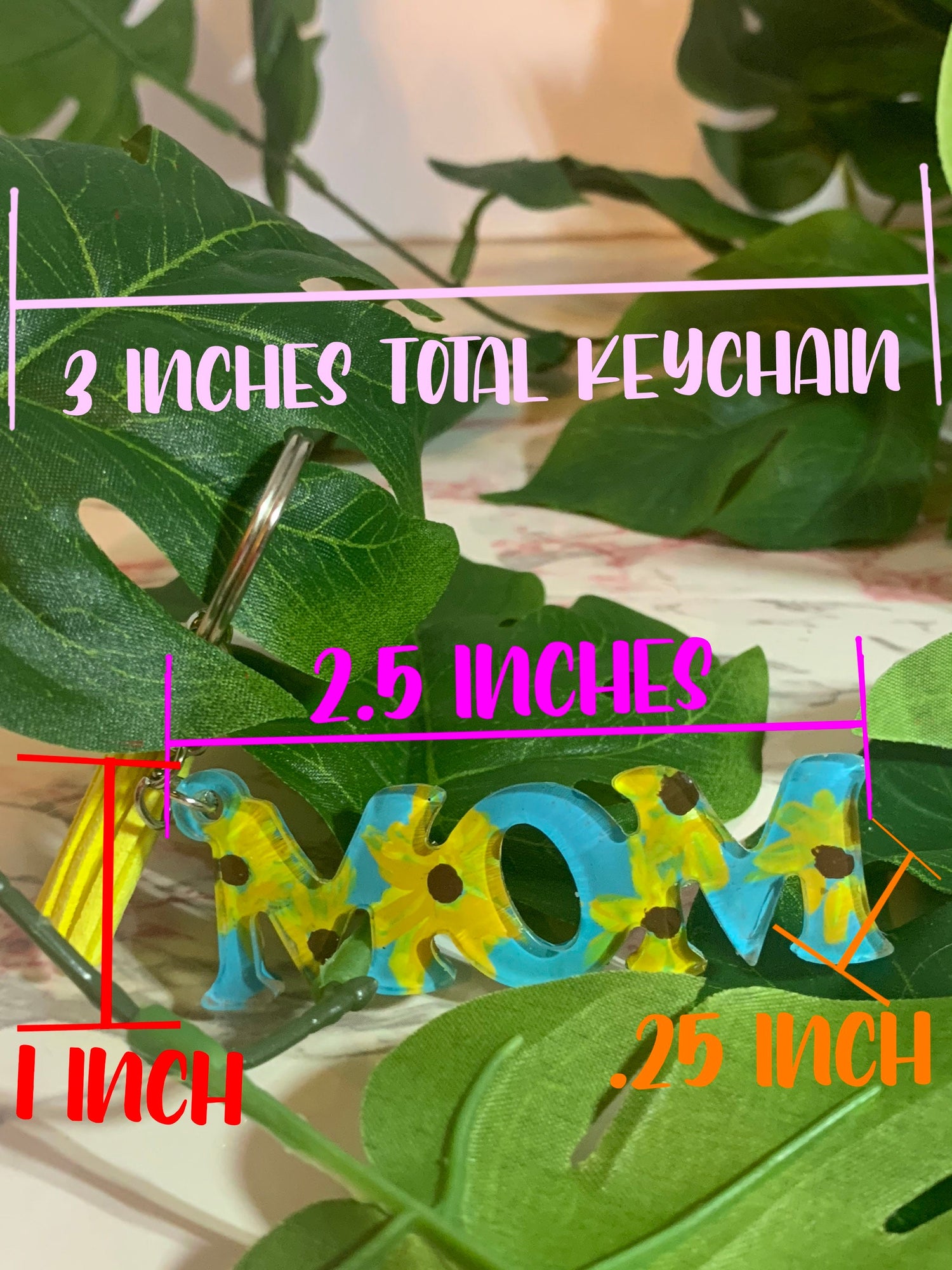 The “mom” measures approximately 1 inches in height, .25 inches deep, and 2 to 2.5 inches in width. Each keychain automatically comes with an O keyring, chain link, and jump ring. From the top of the O keyring to the bottom of the word, the keychain measures approximately 3 inches. Each keychain comes with a colored leather-like tassel as an accent.